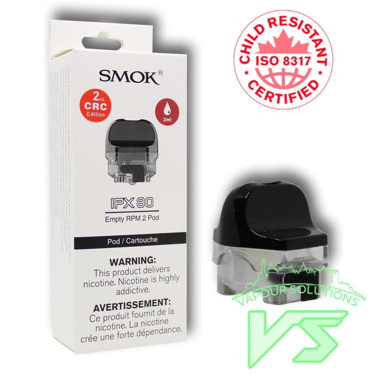 Smok Pods in BC with CRC for IPX 80 Pod Kits, made of PCTG material, with transparent e-juice window, you always know how much juice left by one glance. there are two types of Pods available, the RPM 2 Pods and RPM Pods, both of them with 2ml e-juice, the RPM 2 Pods compatible with RPM 2 Series Coils and RPM Pods compatible with RPM Series Coils for more coil options. the Pods with the duck-billed mouthpiece, less the leakage of the taste and easy to inhale.